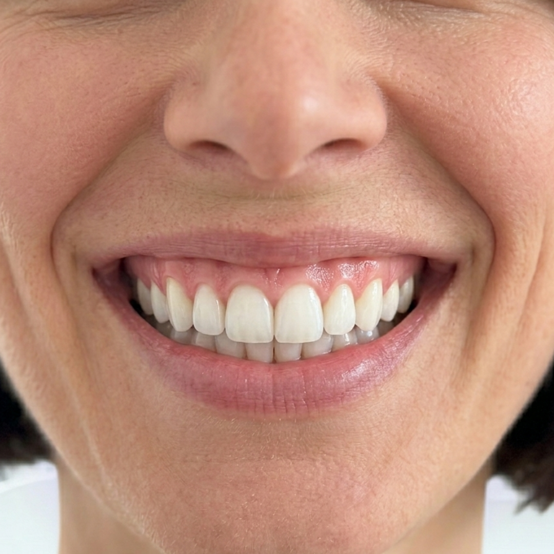 - Gum tissue looks healthy pink instead of pale