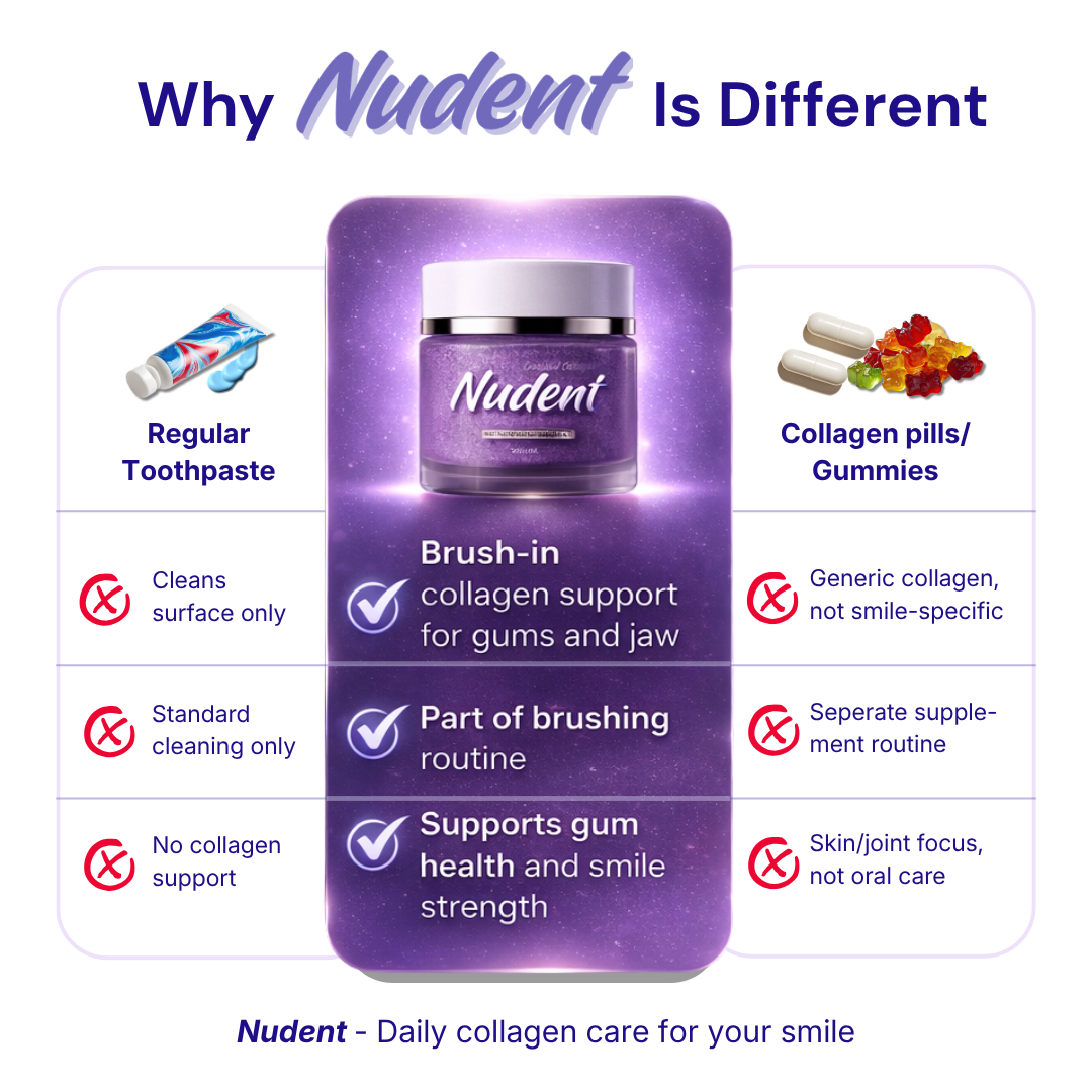 Nudent works differently. It delivers marine collagen peptides directly to your gumline as you brush, exactly where recession happens. Combined with minerals that seal roots and ingredients that stop tissue breakdown, Nudent rebuilds gum tissue while you clean.